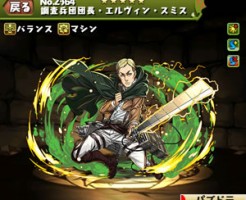 パズドラの調査兵団団長・エルヴィン・スミスのステータス簡易評価とスキル上げ対象モンスター、入手方法まとめです。