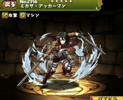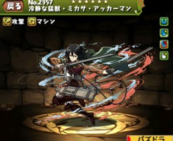 パズドラのミカサ・アッカーマンのステータス簡易評価とスキル上げ対象モンスター、入手方法まとめです。