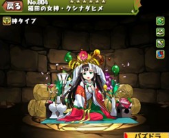 パズドラの献身の巫女神・クシナダヒメの ステータス簡易評価とスキル上げ対象モンスター、入手方法まとめです。