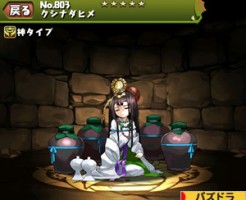 パズドラのクシナダヒメの ステータス簡易評価とスキル上げ対象モンスター、入手方法まとめです。