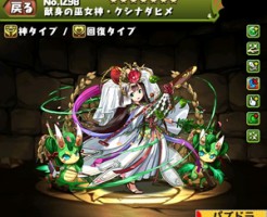 パズドラの庇護の巫女神・クシナダヒメの ステータス簡易評価とスキル上げ対象モンスター、入手方法まとめです。