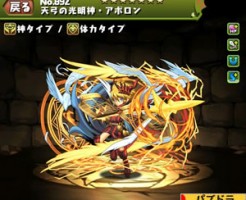パズドラの渾天の光明神・アポロンの ステータス簡易評価とスキル上げ対象モンスター、入手方法まとめです。