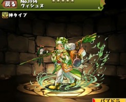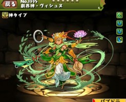 パズドラの創界神・ヴィシュヌの ステータス簡易評価とスキル上げ対象モンスター、入手方法まとめです。 No.1335 創界神・ヴィシュヌ 読み:そうかいしん・ゔぃしゅぬ 神タイプ 属性:木 コスト:25 ★6 最大LV:・・・