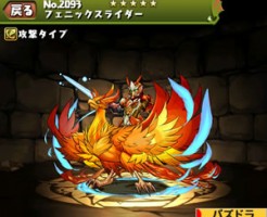 フェニックスライダーのステータス簡易評価と スキル上げ対象モンスター、入手方法まとめです。