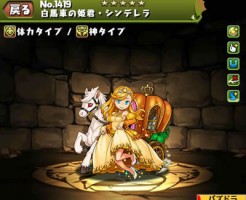 パズドラの白馬車の姫君・シンデレラのステータス簡易評価と スキル上げ対象モンスター、入手方法まとめです。